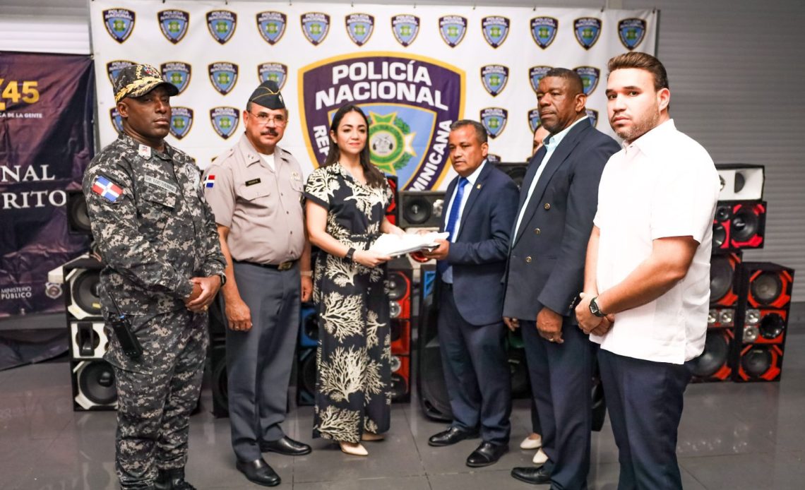 La ministra de Interior y Policía, Faride Raful, entregó a la Procuraduría Especializada de Medio Ambiente en Santo Domingo Oeste 225 bocinas, incautadas en espacios públicos y centros de expendios de bebidas alcohólicas, dónde también decomisaron 205 cámaras de videovigilancia y más de 5,000 mil armas blancas, durante los Operativos Garantía de Paz.