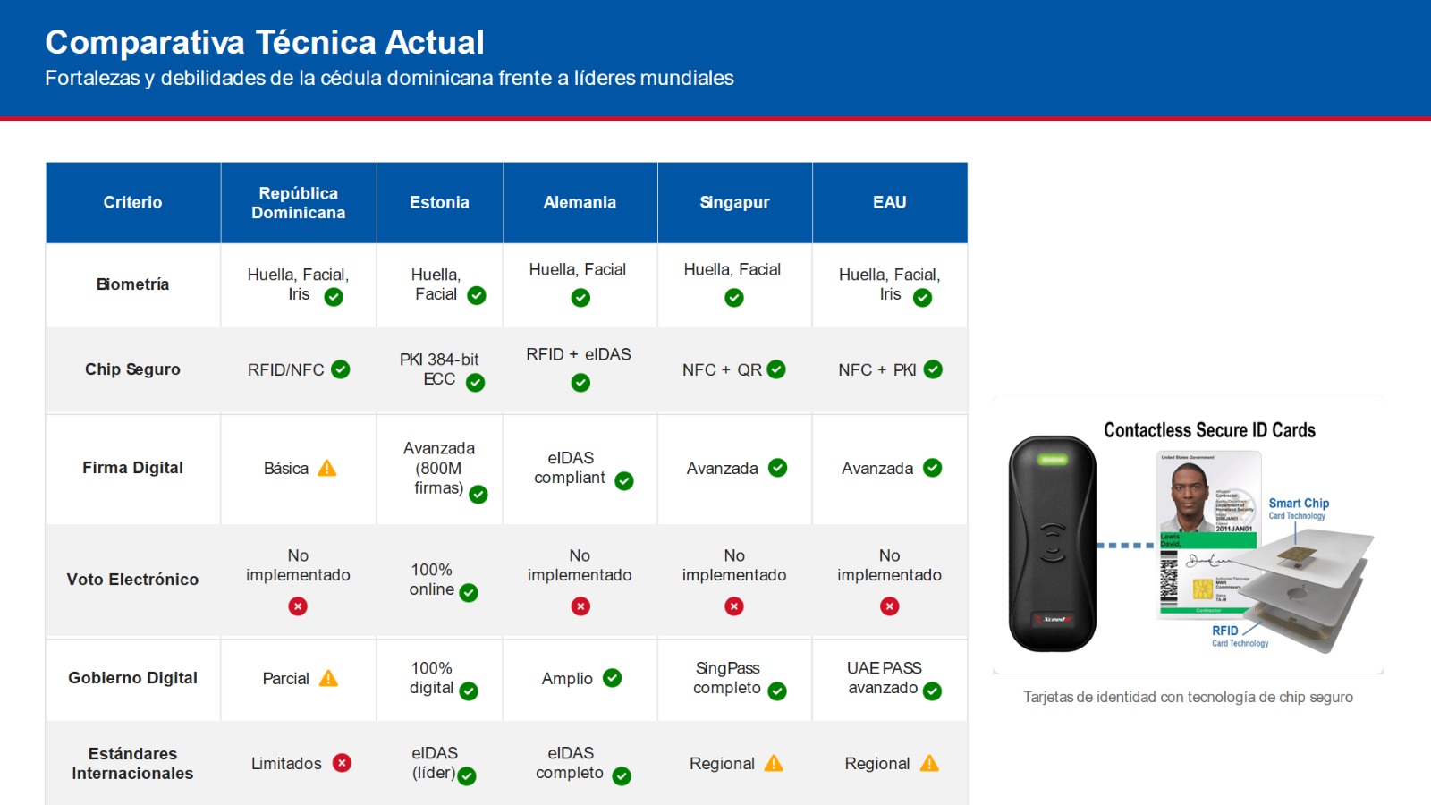 Según explicó, la nueva cédula incorporará tecnologías comparables a las empleadas en países líderes en digitalización, como Estonia, donde el voto se realiza de forma completamente electrónica desde casa. Aunque el proyecto dominicano no contempla de inmediato un sistema de votación 100% online, las mejoras previstas en el chip y en la autenticación digital colocan al país en una posición privilegiada.
