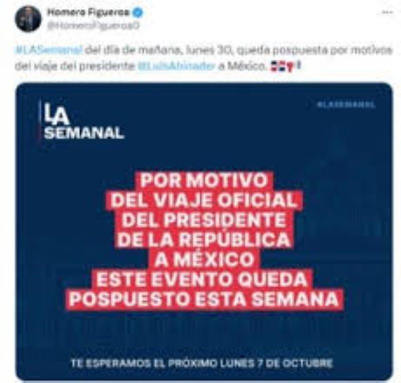 El vocero de la Presidencia, Homero Figueroa informó este domingo que el encuentro del presidente Luis Abinader con la prensa, denominada como La Semanal, queda pospuesta por motivo de que el mandatario viajará a México.