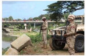 Soldados del Ejército Dominicano y del Cuerpo Especializado en Seguridad Fronteriza Terrestre (CESFRONT), con armas automáticas, protegían este domingo el...